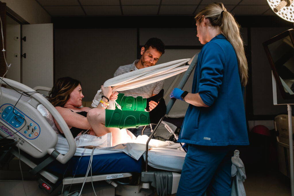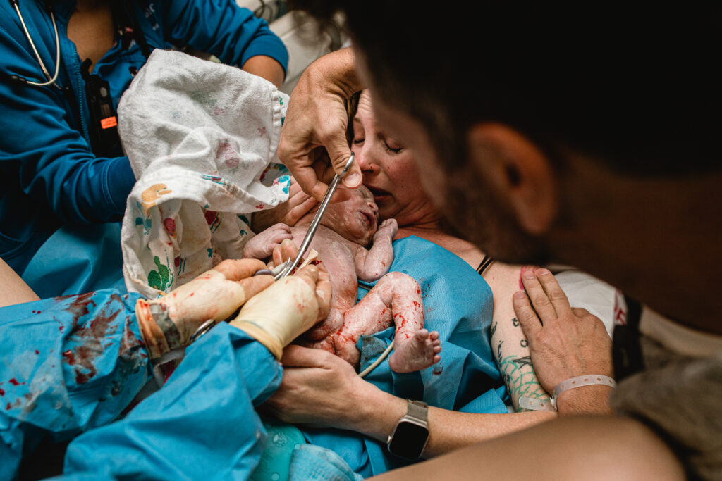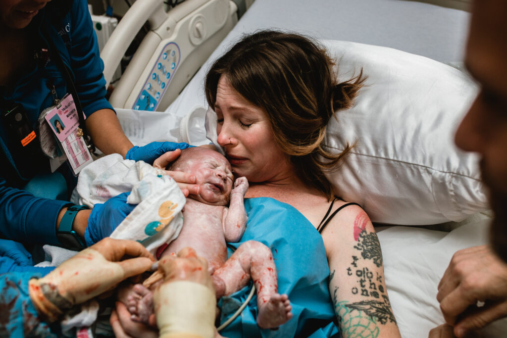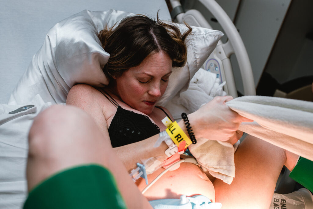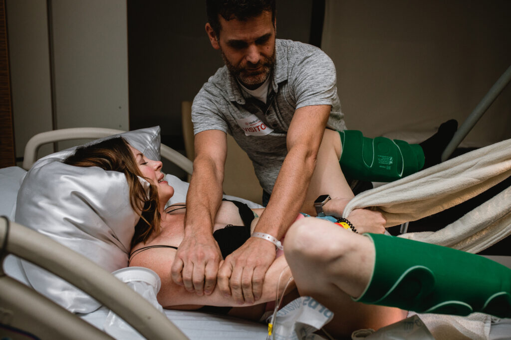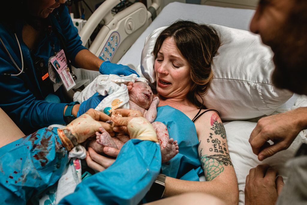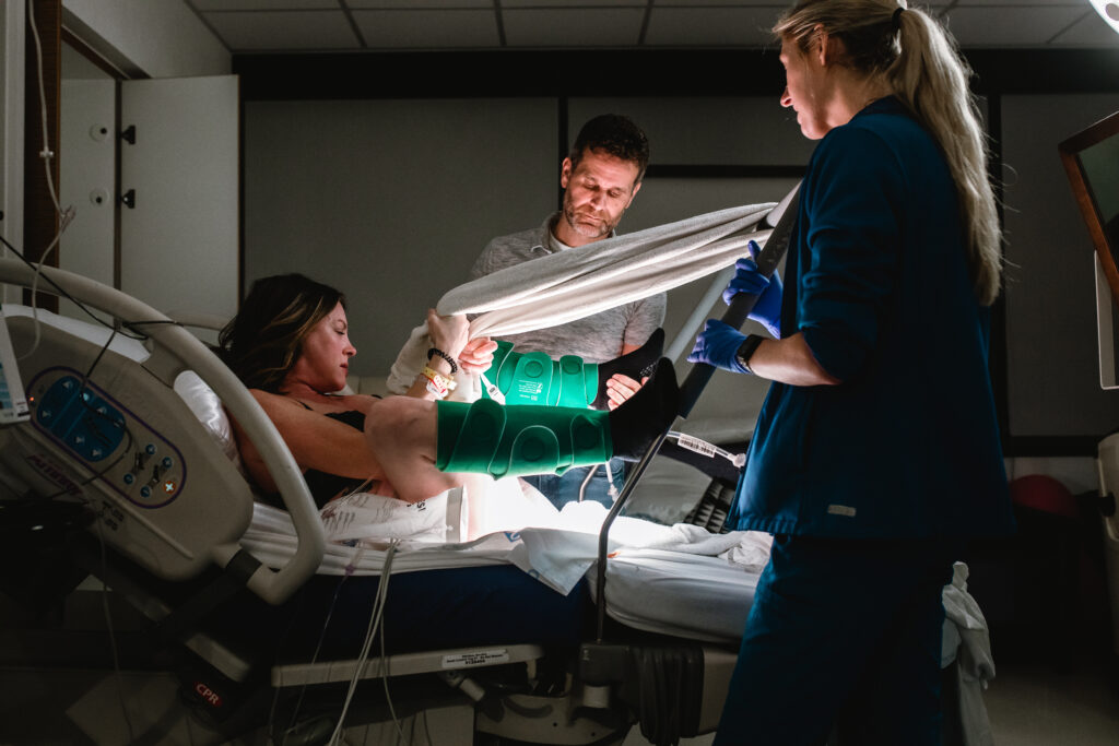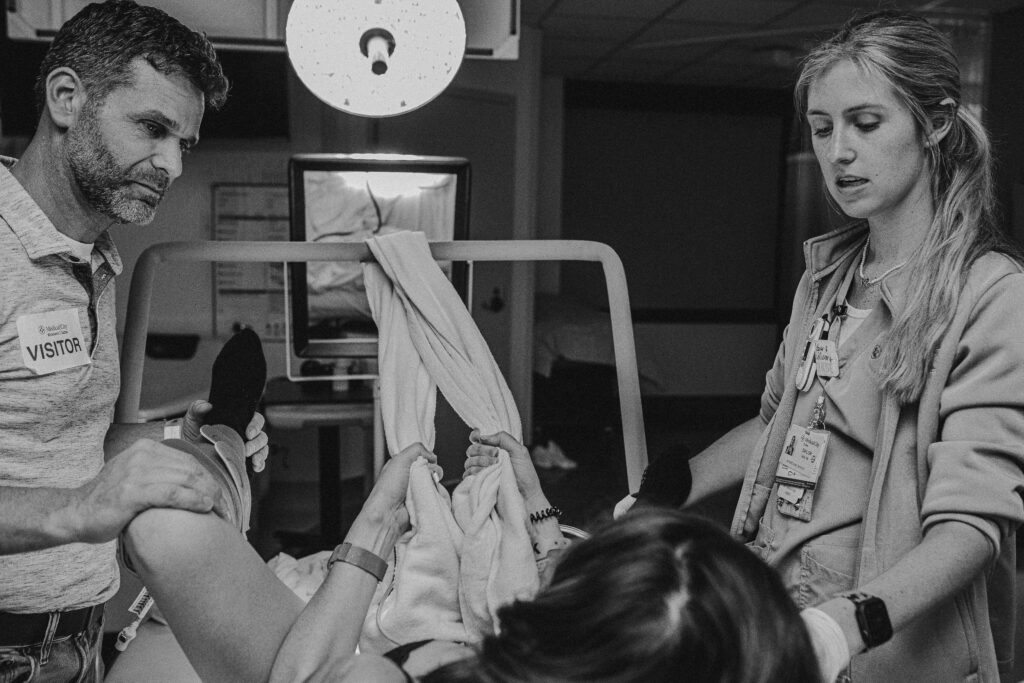 During the pushing stage, her doctor introduced tug-of-war pushing — a grounded, hands-on technique that helped her channel every surge with intention. Her husband never left her side, anchoring her through every contraction, every breath, every moment of doubt and triumph. The room felt steady and reverent — the way birth so often is when a team rallies behind a woman and believes in her.