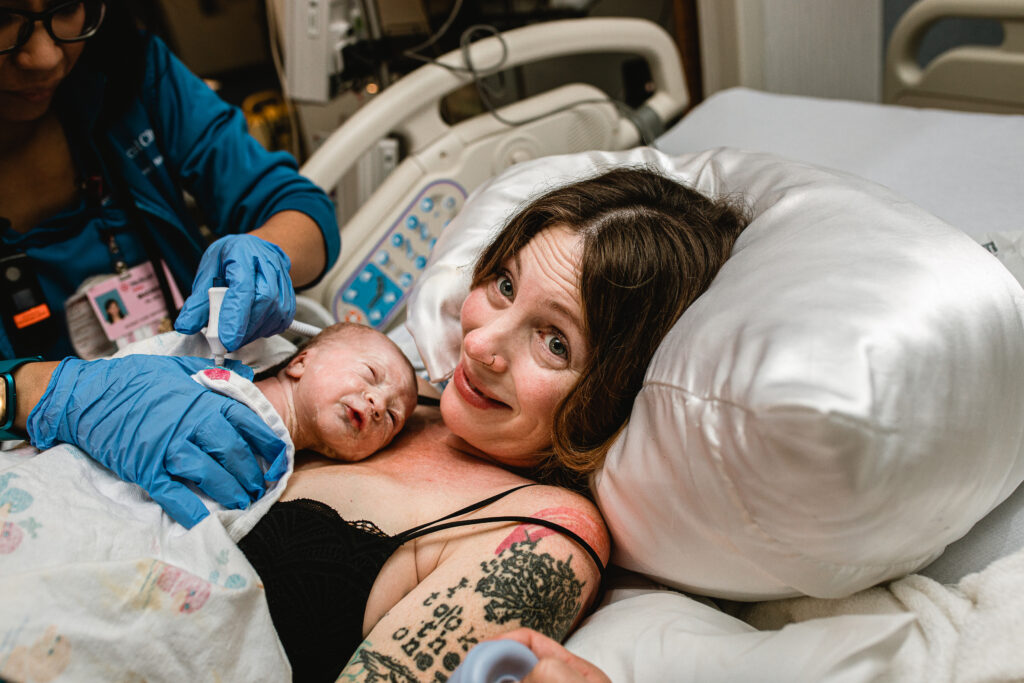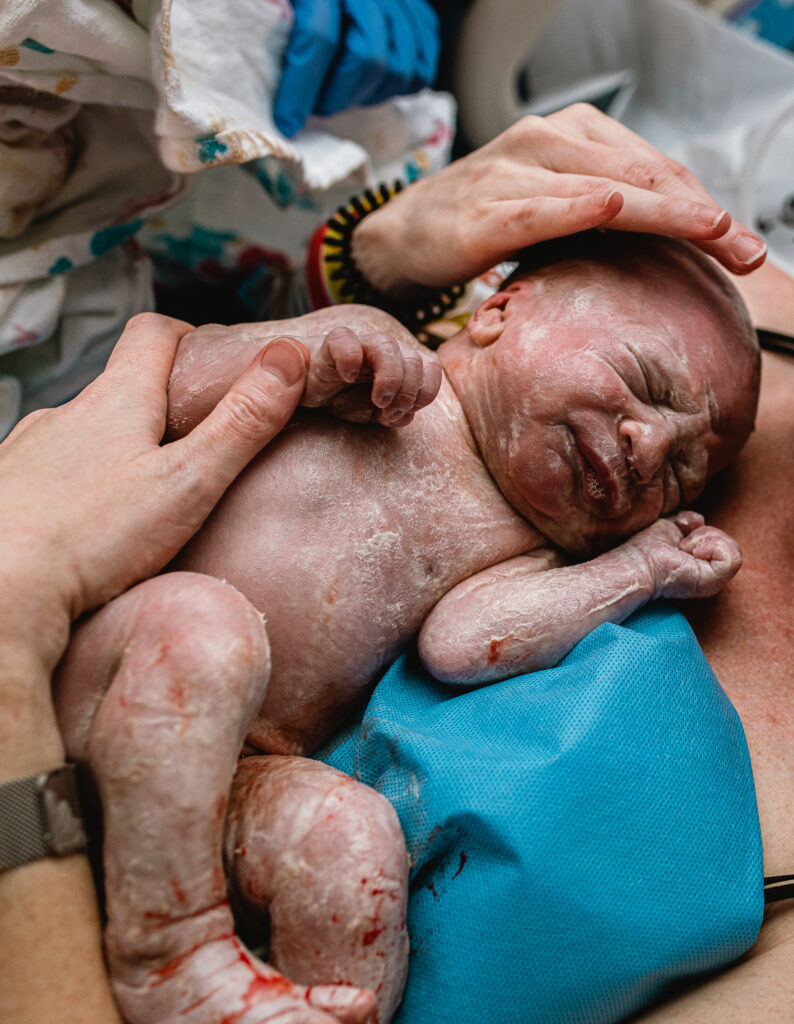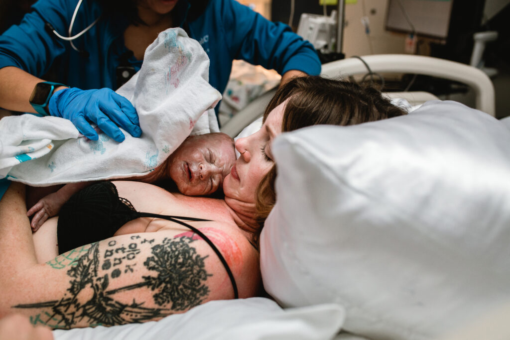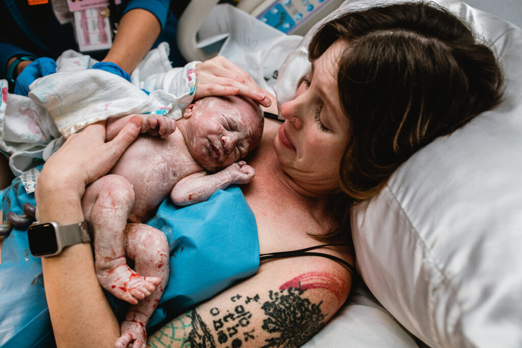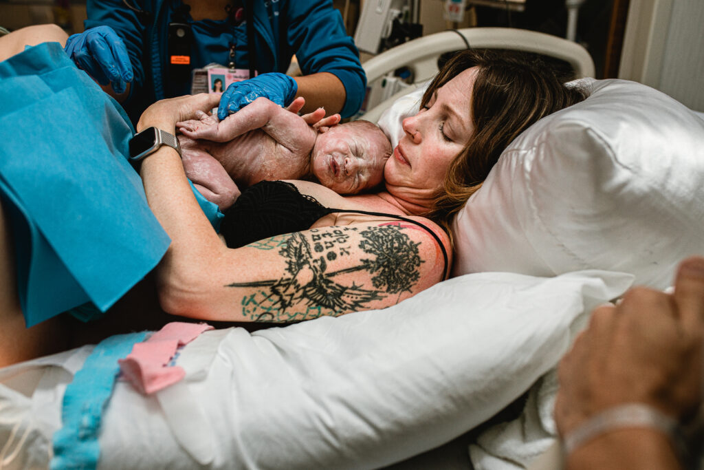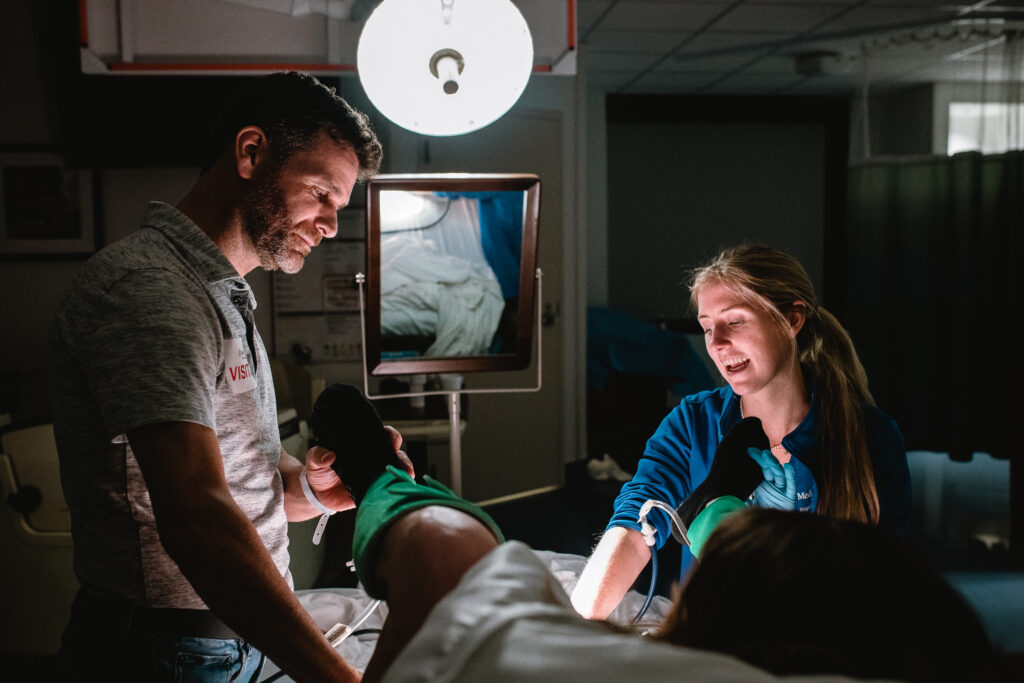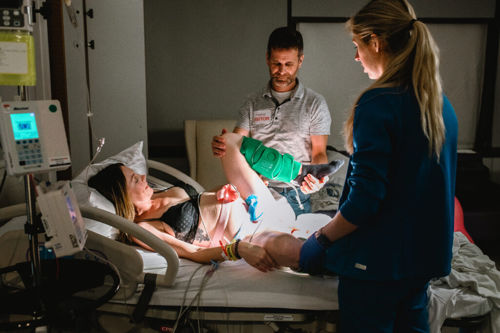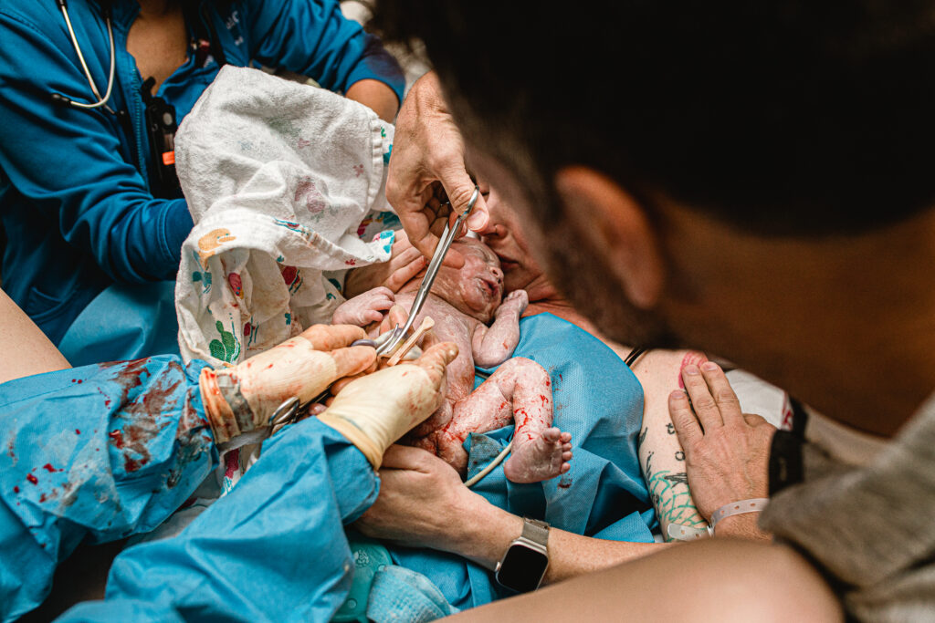 During the pushing stage, her doctor introduced tug-of-war pushing — a grounded, hands-on technique that helped her channel every surge with intention. Her husband never left her side, anchoring her through every contraction, every breath, every moment of doubt and triumph. The room felt steady and reverent — the way birth so often is when a team rallies behind a woman and believes in her.