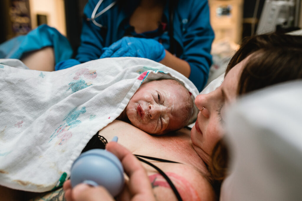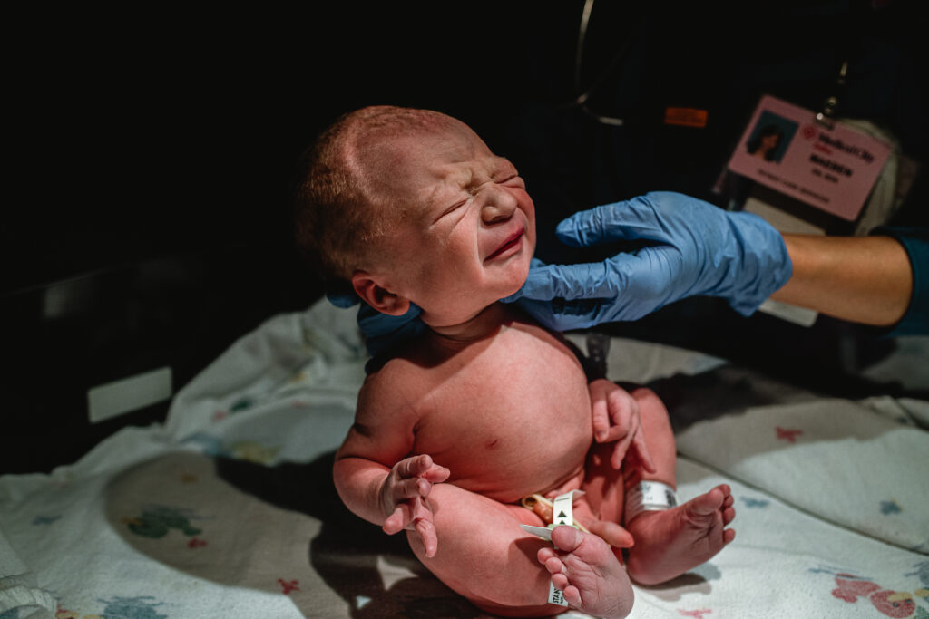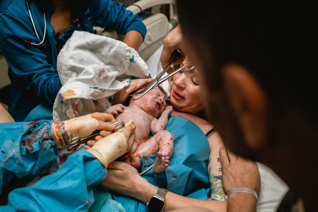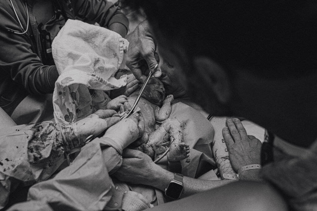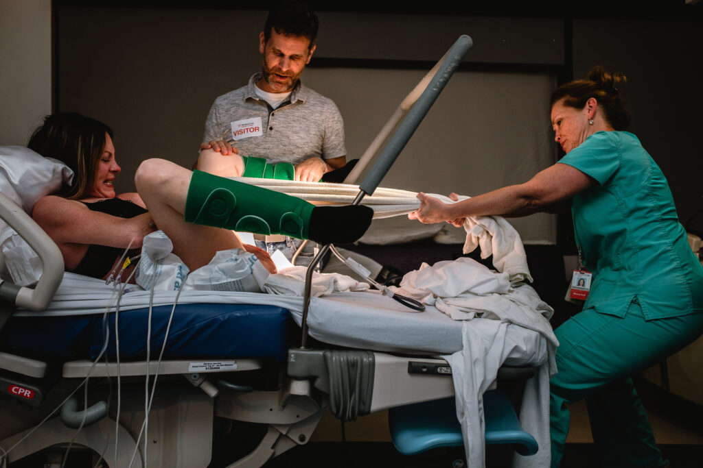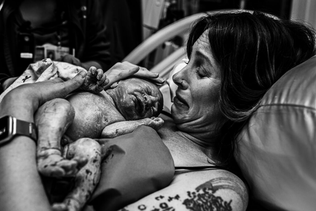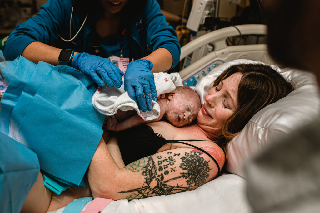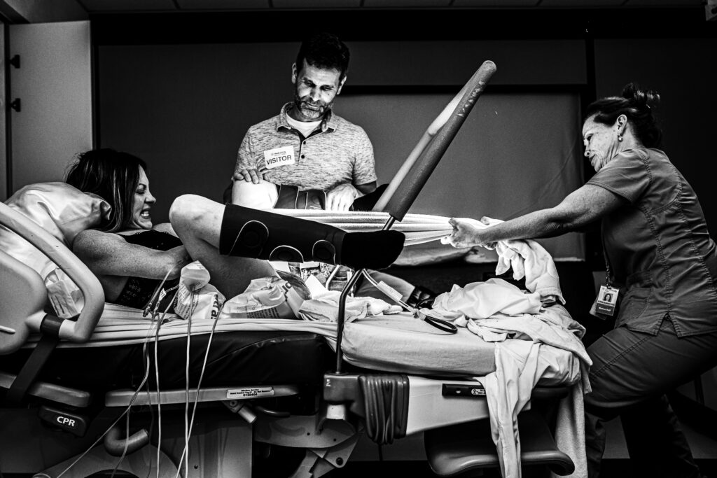 During the pushing stage, her doctor introduced tug-of-war pushing — a grounded, hands-on technique that helped her channel every surge with intention. Her husband never left her side, anchoring her through every contraction, every breath, every moment of doubt and triumph. The room felt steady and reverent — the way birth so often is when a team rallies behind a woman and believes in her.